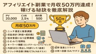 稼げる アフィリエイト副業で月収50万円達成!稼げる秘訣を徹底解説 アフィリエイト副業で月収50万円を達成する秘訣を徹底解説。初心者でも始めやすい方法や成功のポイントを紹介します。あなたもこの機会に稼ぐ力を身につけましょう。 稼げる